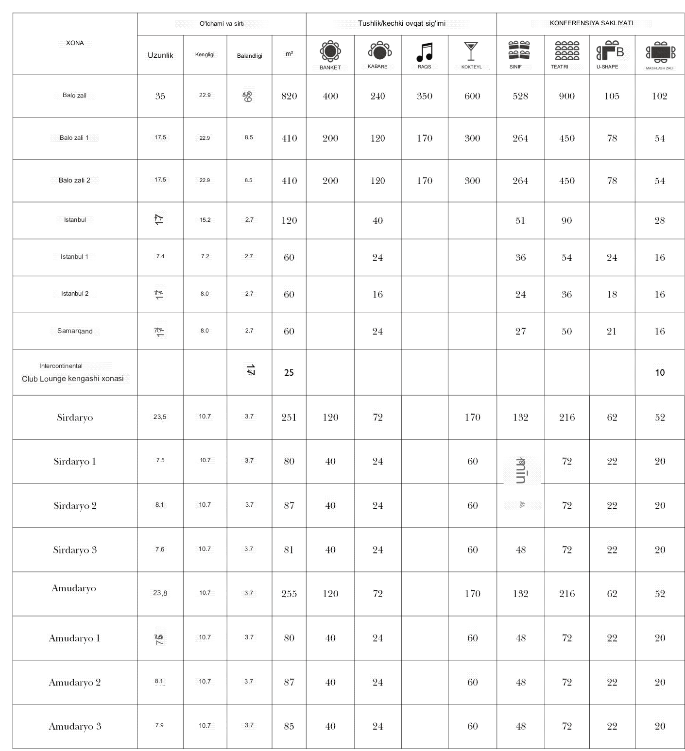 InterContinental Tashkent mehmonxonasining birinchi qavatida har biri 288 m2 maydonga ega Amudaryo va Sirdaryo majlis zallari va keng qabulxona mavjud.